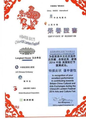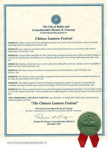 Special recognition as the reputable producer of "Chinese Lantern Festival" with quality lights by city of Dallas, US